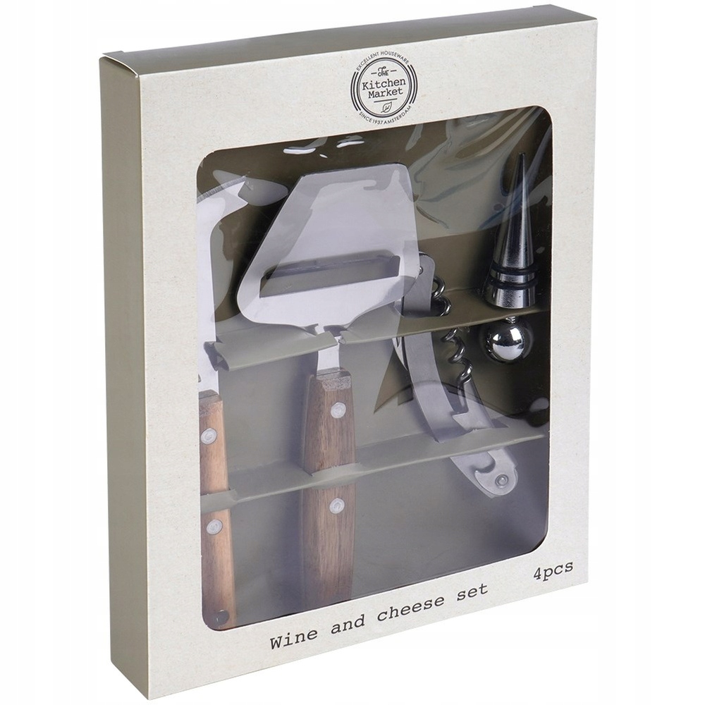 Akcesoria do wina i sera wykonane z trwałych materiałów. W zestawie znajdują się cztery praktyczne akcesoria: korkociąg, zatyczka do wina, nóż do sera, a także krajalnica. Zestaw jest funkcjonalny oraz stylowy, co sprawia, że będzie również elementem dekoracyjnym w kuchni lub jadalni. Akcesoria sprawdzą się podczas przyjęć, a także kameralnych spotkań. Zestaw akcesoriów to idealny pomysł na prezent dla miłośników wina i sera. Wyprodukowano zgodnie z europejskimi standardami.