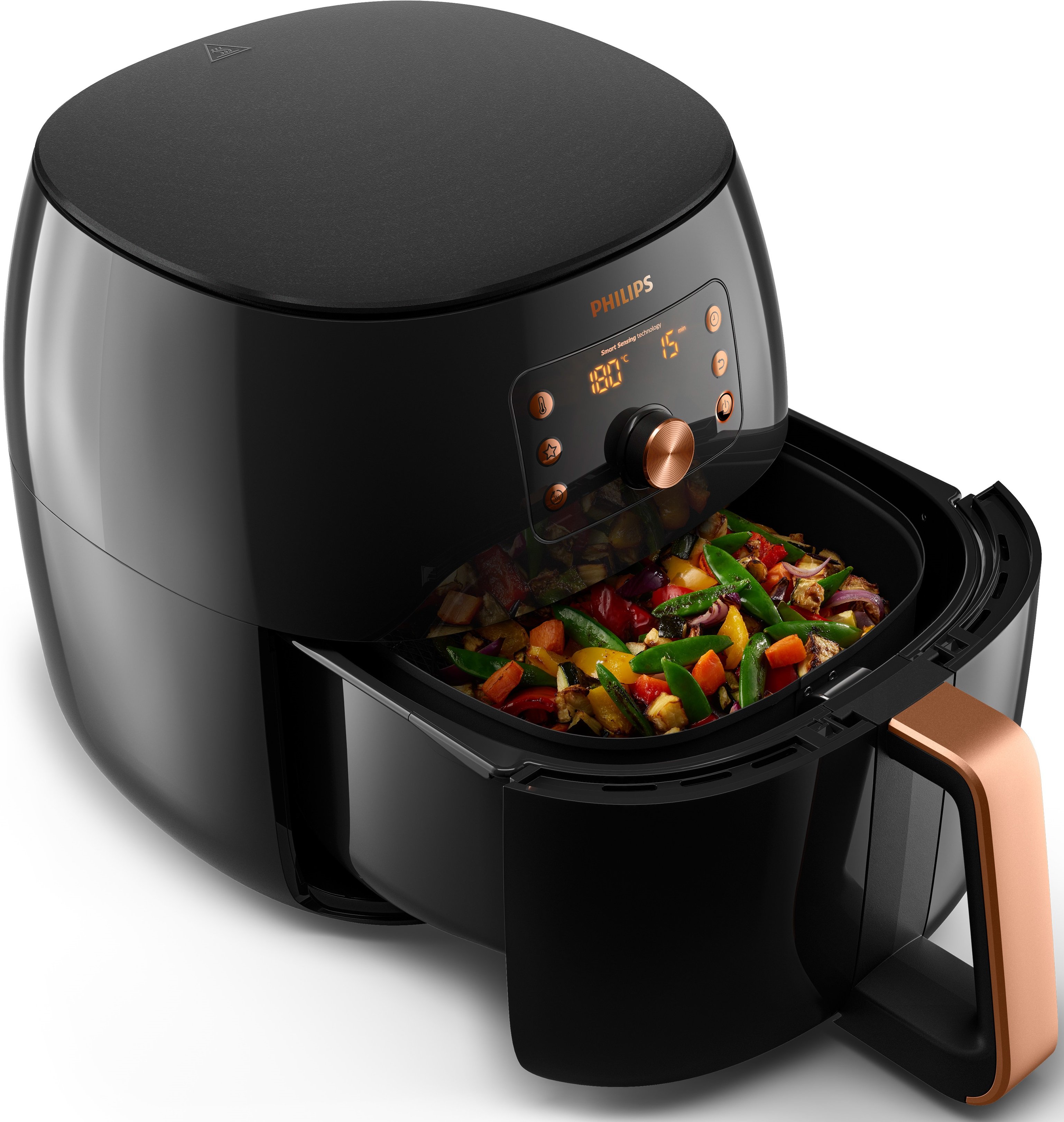 Dzięki technologii Rapid Air, urządzenie wykorzystuje szybki przepływ gorącego powietrza, co pozwala na smażenie, pieczenie i grillowanie bez użycia tłuszczu. Chrupiąca skórka i delikatne wnętrze – wszystko to z 90% mniej tłuszczu w porównaniu do tradycyjnych metod smażenia.