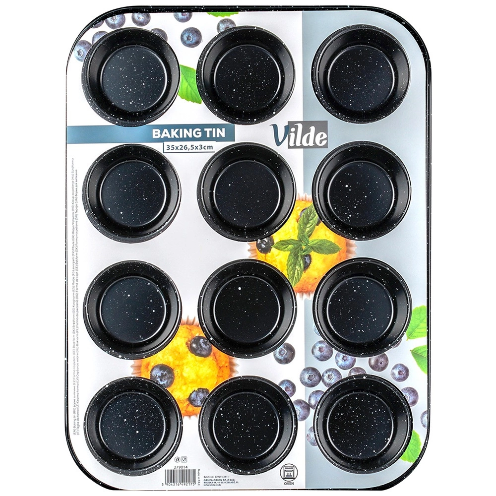 Granitowa forma do muffinek marki Vilde to niezbędnik każdego miłośnika domowych wypieków. Dzięki 12 otworom umożliwia jednoczesne przygotowanie tuzina pysznych muffinek – zarówno słodkich, jak i wytrawnych. Wykonana z wysokiej jakości stali węglowej i pokryta powłoką granitową, gwarantuje trwałość, wygodę i niezawodne rezultaty pieczenia. Doskonale sprawdzi się zarówno podczas codziennego pieczenia, jak i przy przygotowywaniu wypieków na specjalne okazje.