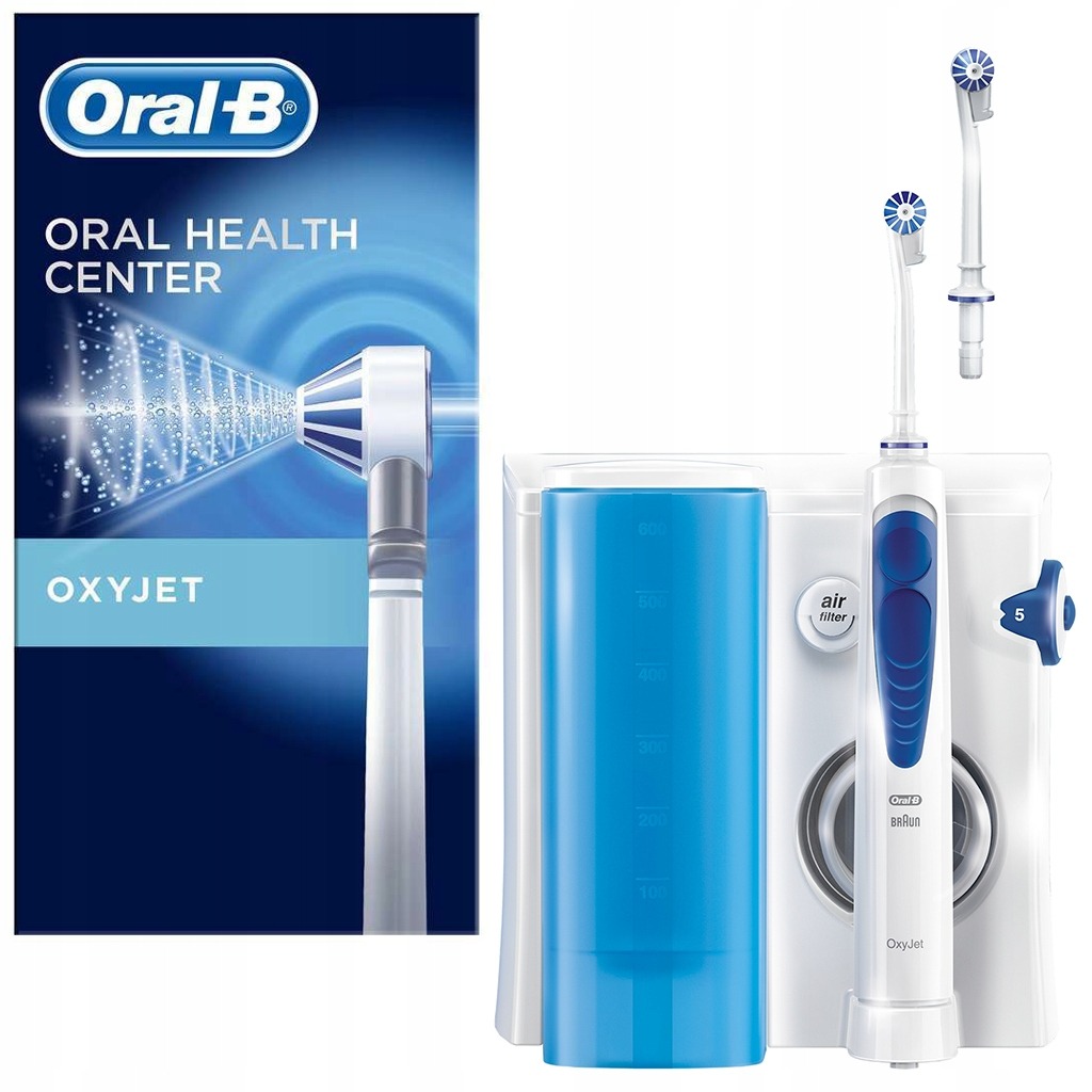 Irygator jamy ustnej Oral-B Oxyjet ma obracający się strumień, który wzbogaca wodę w mikropęcherzyki powietrza z oczyszczonego powietrza, poprawiając w ten sposób zdrowie dziąseł i jednocześnie masując dziąsła.