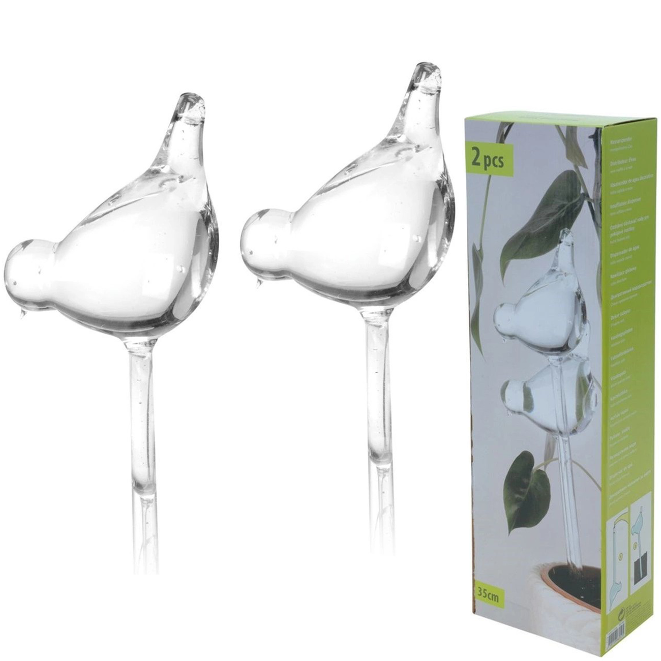 Zestaw dwóch szklanych kul w kształcie ptaków, przeznaczonych do nawadniania roślin w doniczkach. Przydatne do nawadniania roślin podczas nieobecności w domu, ale również idealne rozwiązanie dla osób, które nie są systematyczne w podlewaniu roślin. Z ich pomocą utrzymasz zdrowy i piękny wygląd roślin przez dłuższy czas. Produkt jest bardzo łatwy w użytkowaniu, kiedy wilgotność w ziemi spadnie, roślina pobierze z kuli wodę.