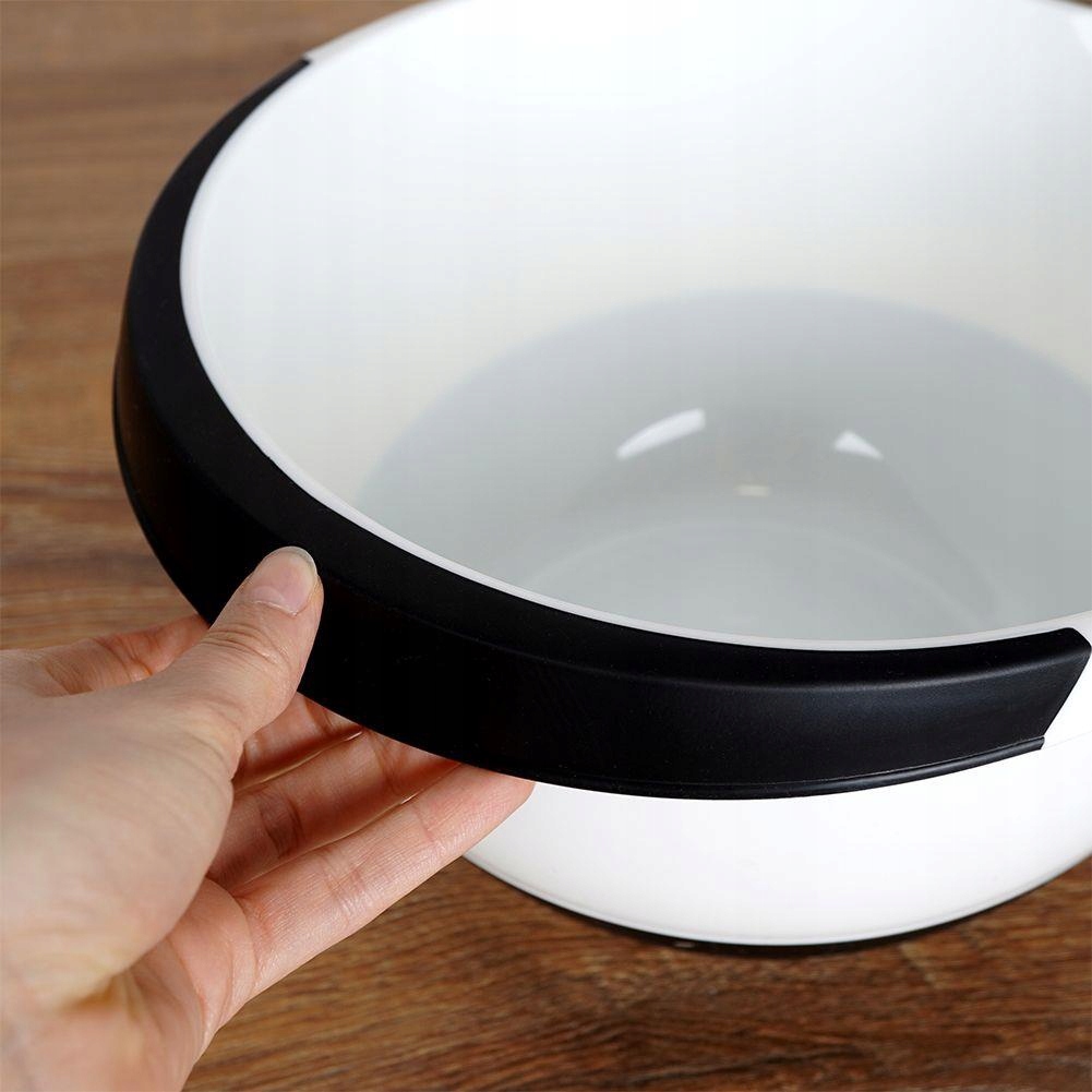 - WYGODNA - Miska wyposażona w dwu-częściową pokrywkę, zapobiegającą pryskaniu. Dodatkowo miska posiada antypoślizgową podstawę, która zapewnia stabilność podczas użytkowania oraz dzióbek, który zapewni wygodne wylewanie zawartości miski.