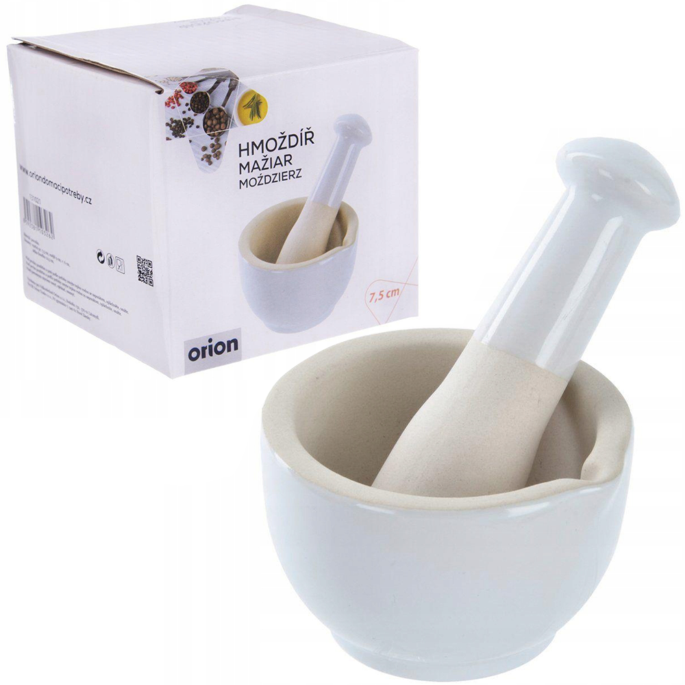 Moździerz z tłuczkiem solidnie wykonany z kamionki w białym kolorze. Wyjątkowo przydatny w kuchni podczas ucierania przypraw, nasion, ziół i orzechów. Dzięki swojej solidnej konstrukcji będzie niezbędnym narzędziem w Twojej kuchni. Oryginalny produkt czeskiej marki Orion. Wyprodukowano zgodnie z europejskimi standardami.