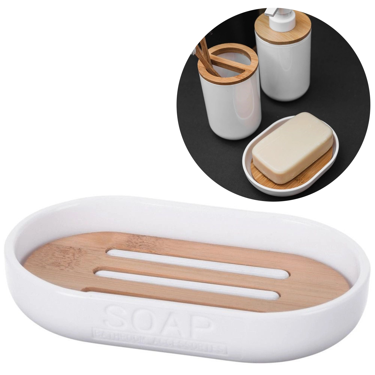 - WYTRZYMAŁA - Wykonana z najwyższej jakości tworzywa w kolorze białym. W centralnym miejscu ma efektowny napis "SOAP bathroom accessories". Posiada wkładkę wykonaną z drewna bambusowego. Mydelniczka jest lekka, poręczna i jednocześnie wytrzymała.