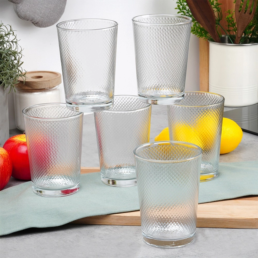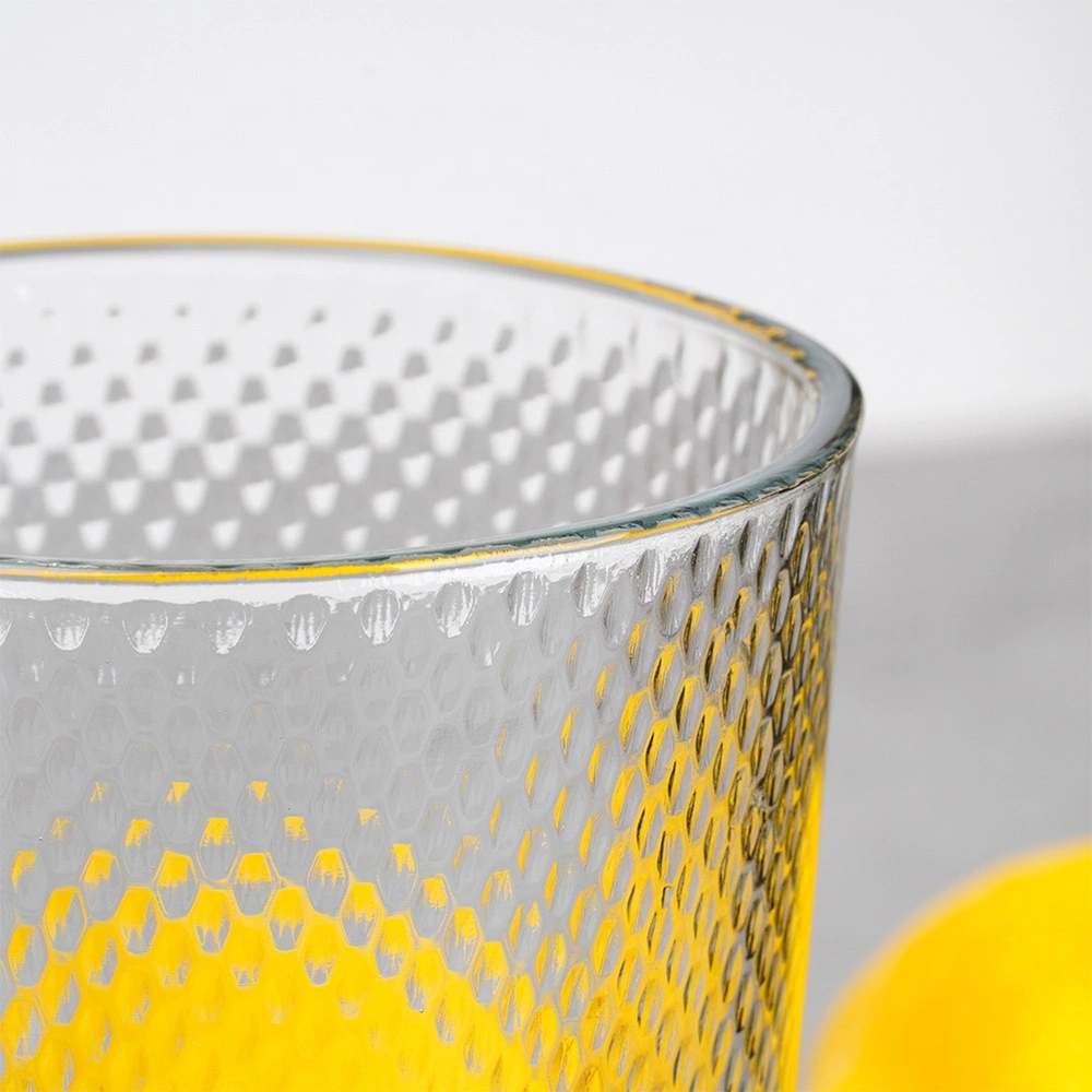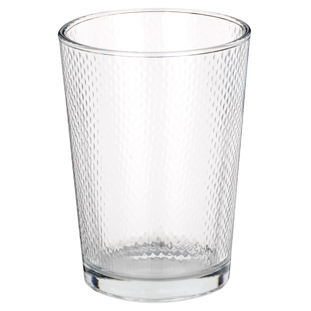Szklanki wykonane zostały z grubego szkła, które nie tylko zapewnia trwałość, ale też pięknie prezentuje się na stole. Ich przezroczysta powierzchnia z delikatnym zdobieniem podkreśla wygląd serwowanych napojów – od klasycznej wody, przez soczyste soki, aż po kolorowe drinki.