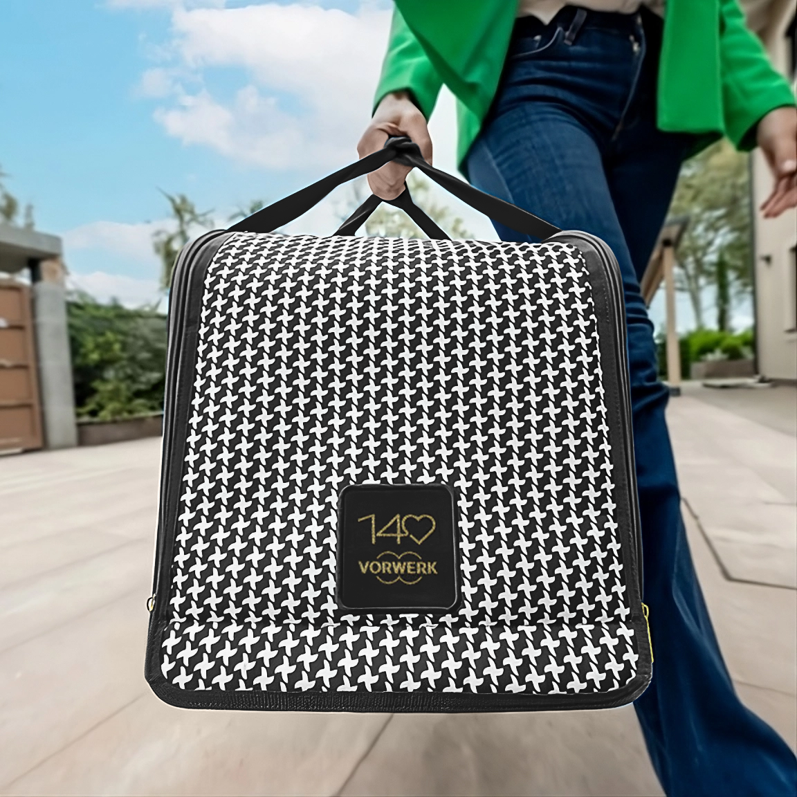 Torba wykonana jest z trwałej tkaniny poliestrowej 600D, co czyni ją odporną na uszkodzenia i warunki zewnętrzne. Solidne zamki błyskawiczne oraz dodatkowe zapięcia na rzep zapewniają łatwość użytkowania i pełną ochronę podczas przenoszenia. Dodatkowo, eleganckie uchwyty przy zamkach grawerowane w kolorze złotym oraz naszywka "140 Vorwerk" nadają torbie prestiżowy wygląd.
