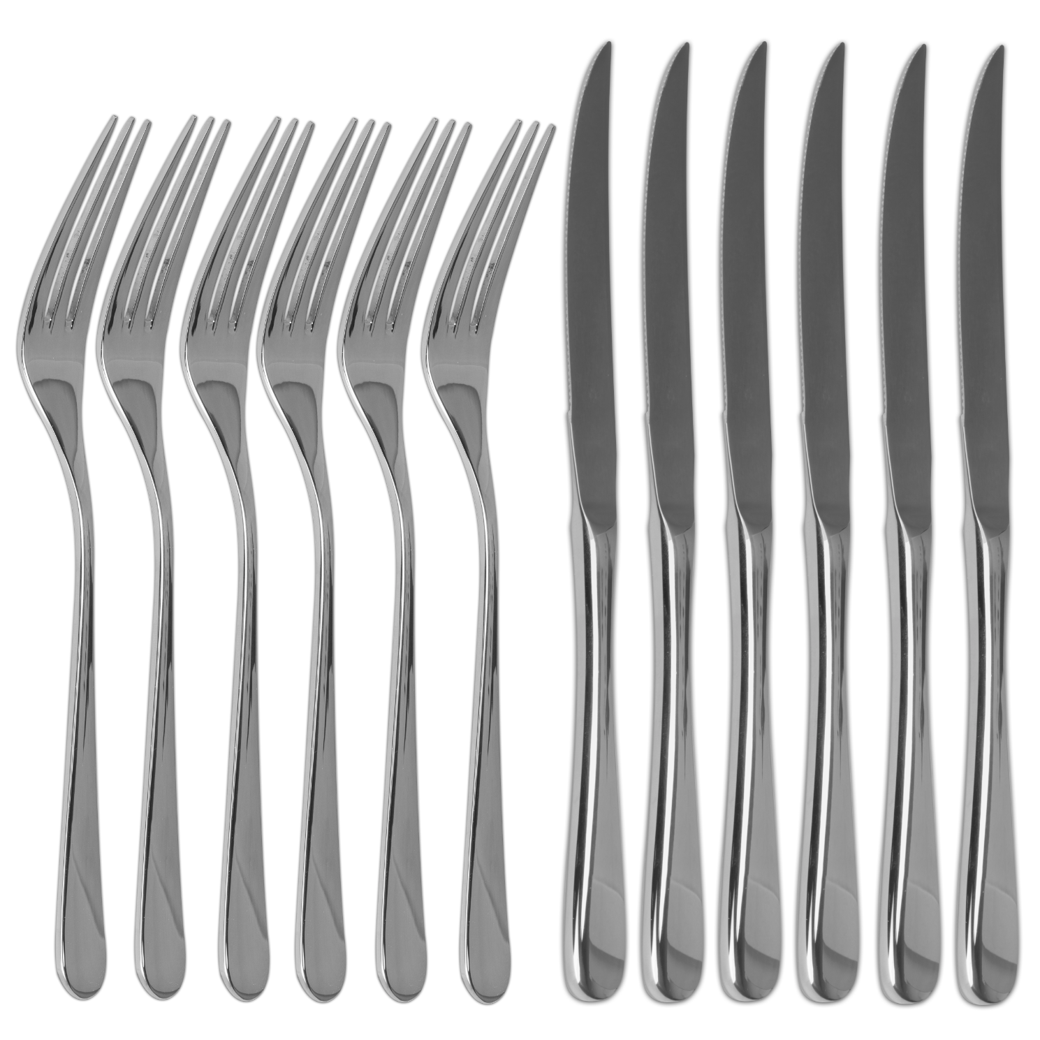Komplet sztućców do steków składa się z 6 noży i 6 widelców. Noże posiadają ząbkowane ostrza, które bez trudu przecinają chrupiącą powierzchnię grillowanego mięsa. Nóż jest wykonany z jednego kawałka stali i jest solidny oraz wytrzymały na wiele lat użytkowania.