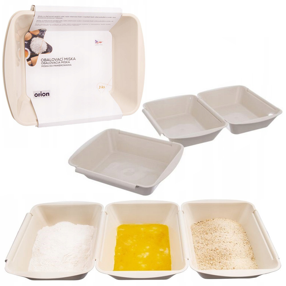 Zestaw trzech pojemników przydatnych do panierowania. Pojemniki są stworzone tak, aby ułatwić panierowanie. Możemy śmiało umieścić w nich jajka, mąkę oraz bułkę tartą. Panierowanie w nich będzie bardzo wygodne. Pojemniki są łatwe w przechowywaniu, gdyż możemy schować jeden w drugim. Dzięki pojemnikom unikniemy zabrudzeń w kuchni i rozsypanej bułki tartej.